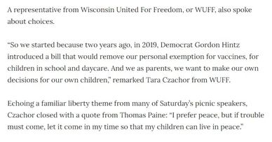 On behalf of the 150 local residents attending in opposition, in addition to health freedom advocacy non-profit Wisconsin United For Freedom, I would like to express sincere gratitude to the Sauk County supervisors who put aside individual inclinations and recognized that this is not about vaccination, but rather, preserving fundamental rights.